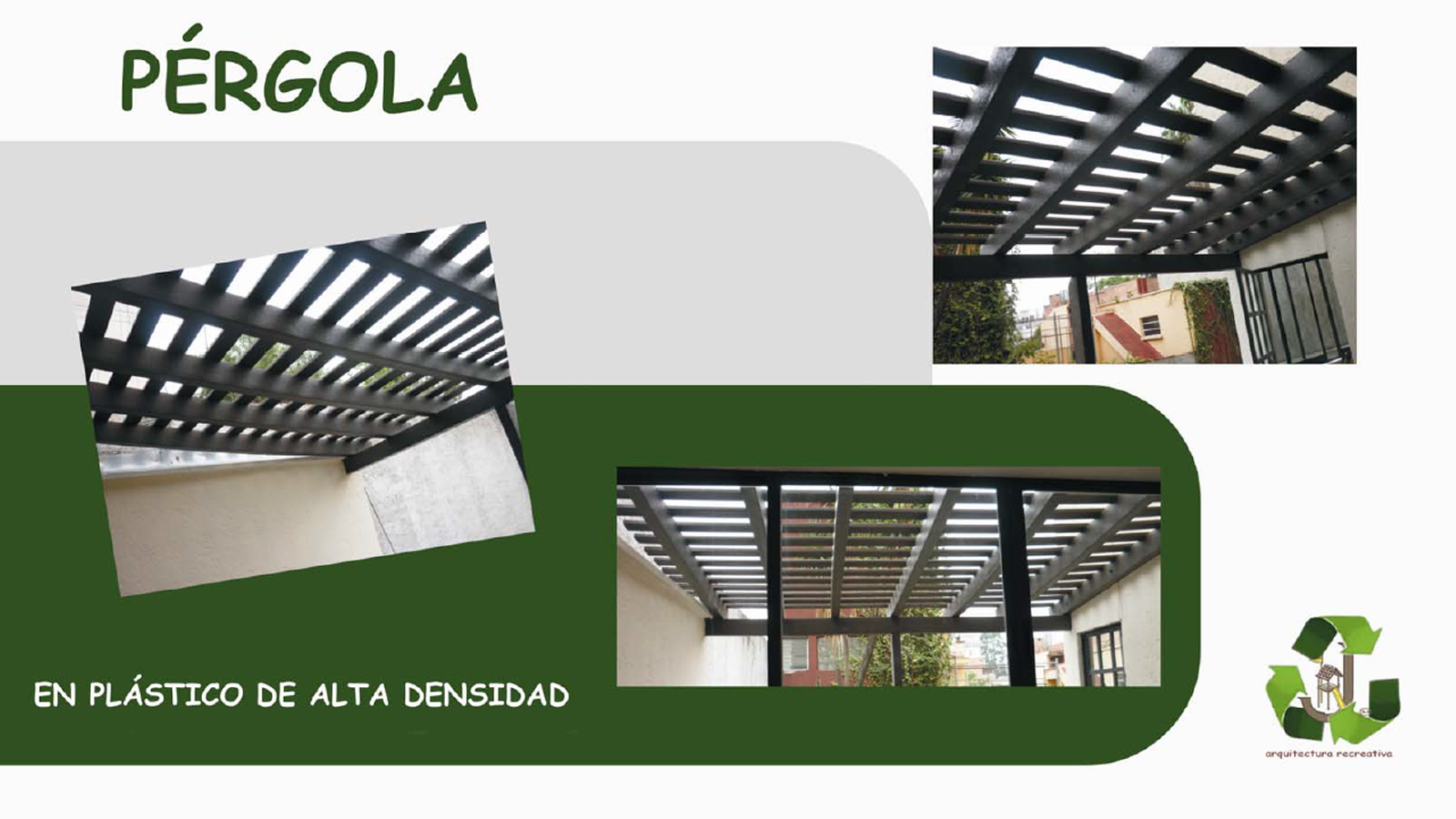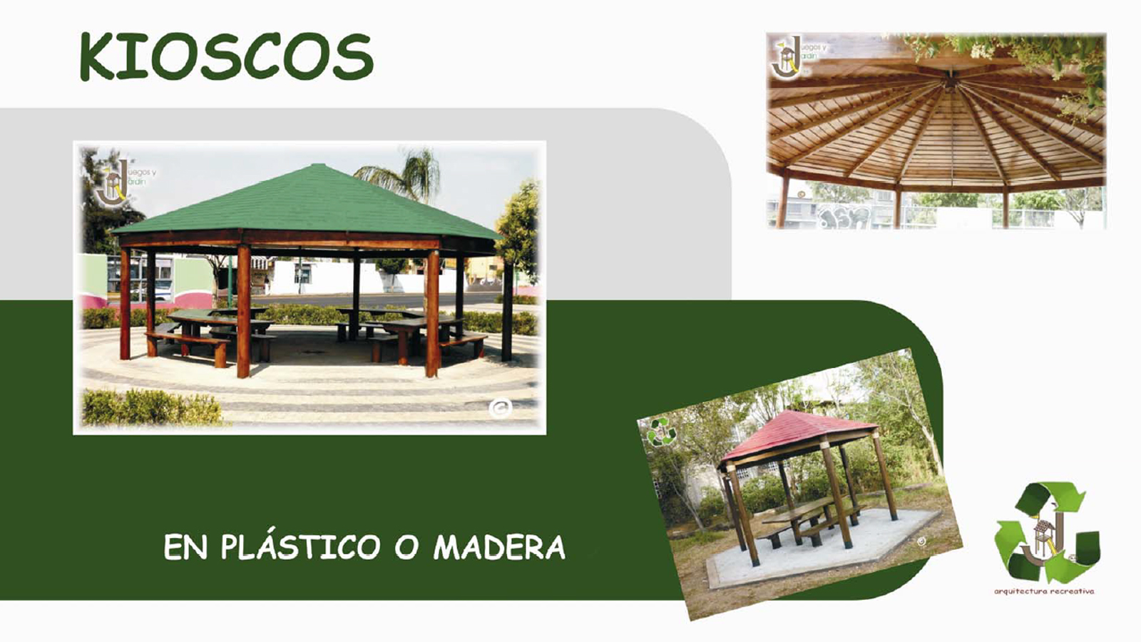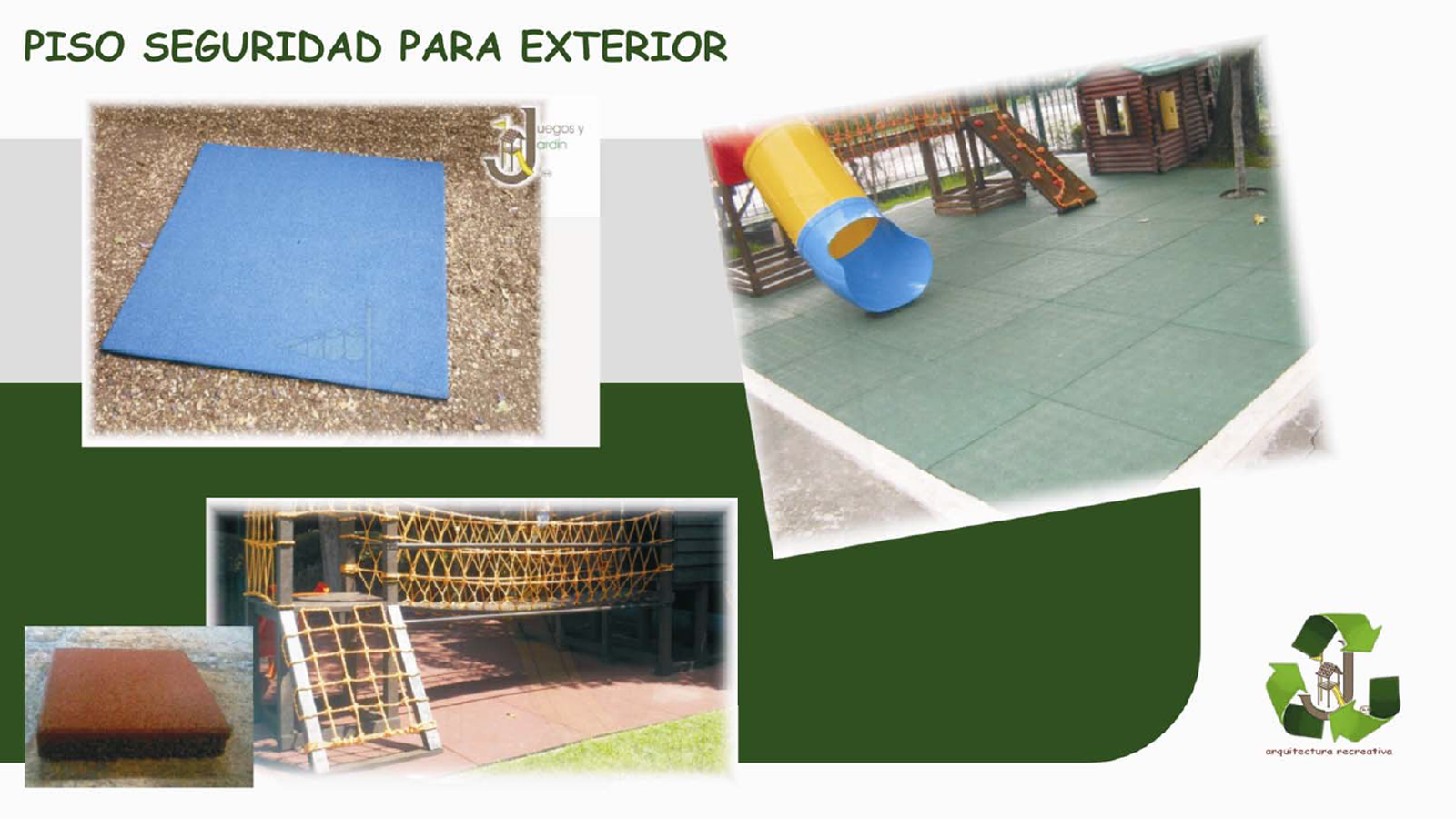 1.Madera tratada con conservadores biodegradables y acabado en poliéster de alta resistencia a la intemperie. 2.Plástico sólido de alta densidad con acabado en pintura epóxica. 3.Metal. 4. Adicionales como barandales, telarañas y trepaderos tejidos con cuerda ARME. Los resbaladeros en fibra de vidrio con color integral o plástico de diferentes colores.